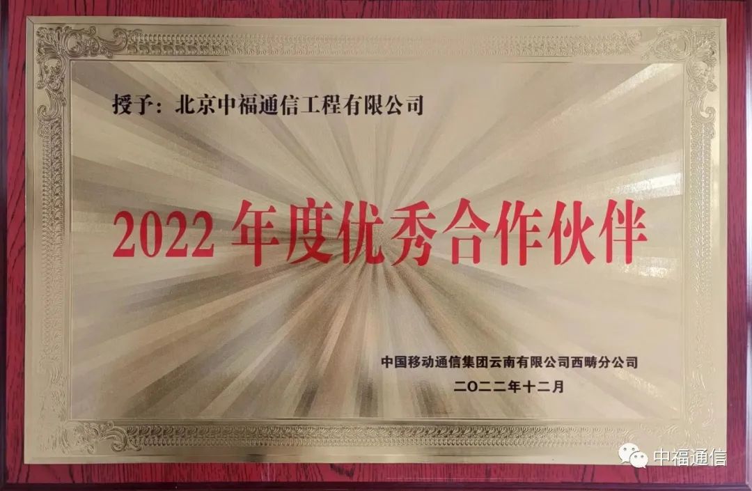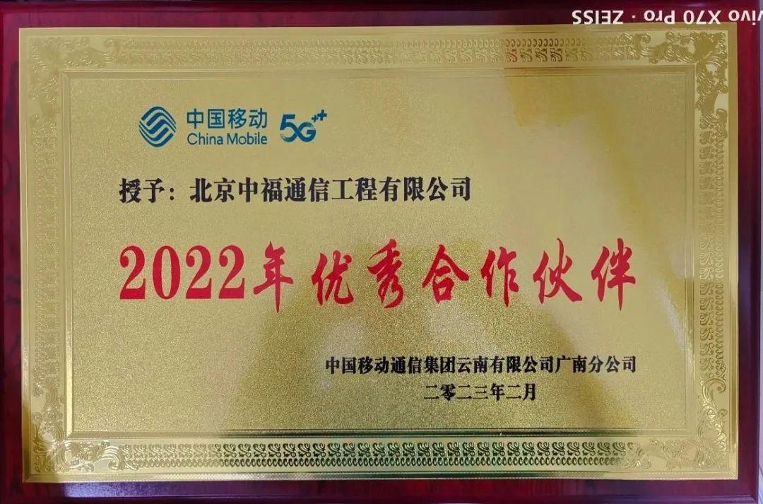2022年12月,文山項(xiàng)目部在2022年12月獲得了中國移動通信集團(tuán)云南有限公司西疇分公司及中國移動通信集團(tuán)云南有限公司廣南分公司頒發(fā)的“2022年度優(yōu)秀合作伙伴”獎牌。