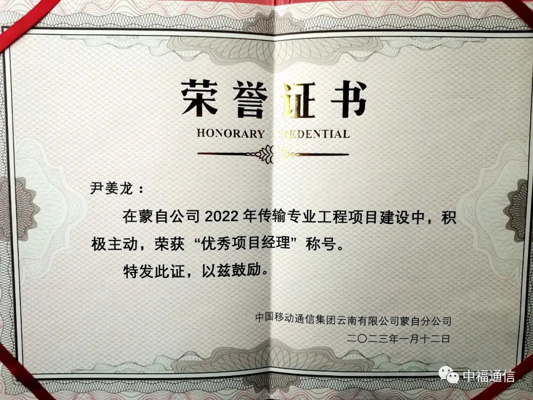 紅河項(xiàng)目部尹姜龍?jiān)?/span>2023年1月獲得中國移動通信集團(tuán)云南有限公司蒙自分公司“優(yōu)秀項(xiàng)目經(jīng)理”稱號。