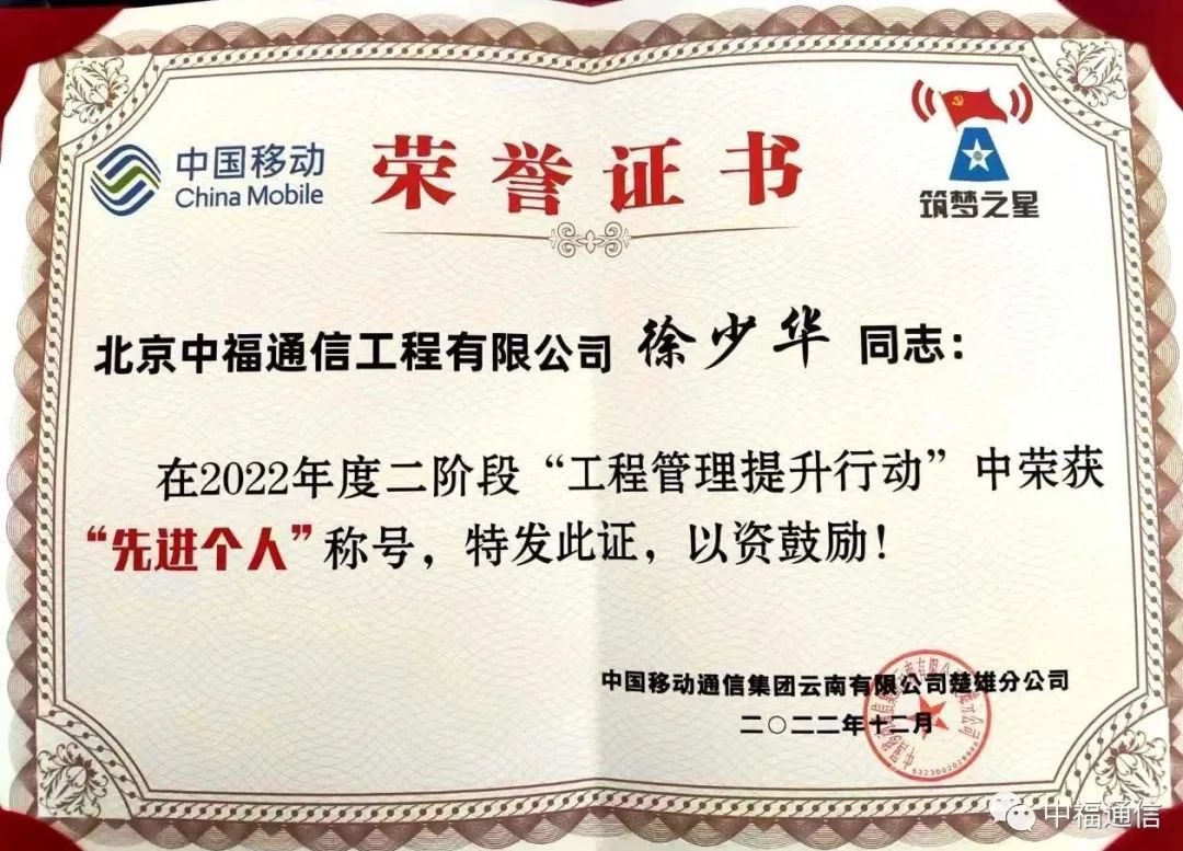 與此同時,中國移動通信集團(tuán)云南有限公司楚雄分公司在2022年度第二階段“工程管理提升行動”中授予徐少華同志“先進(jìn)個人”稱號。
